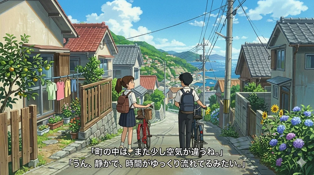 少年: 「海が、僕たちに何かを伝えようとしているみたいだ。降りてみようか?」
